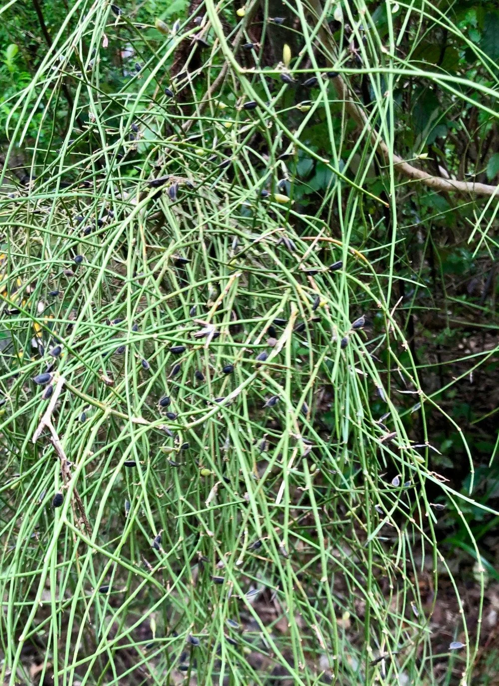 A common small tree can be recognised by its many flattened green twigs that are prominently clustered at the top of its grey-brown branches. The twigs themselves are distinctly flattened and grooved, measuring between 2 to 8mm in width, and they feature scattered small inconspicuous leaves. These leaves are unique, as they are composed of three leaflets each. During the blooming period, the tree produces small flowers that are white in colour, boasting a striking purple center, which are arranged in clusters along the twigs, adding to the tree's aesthetic appeal.